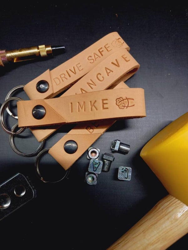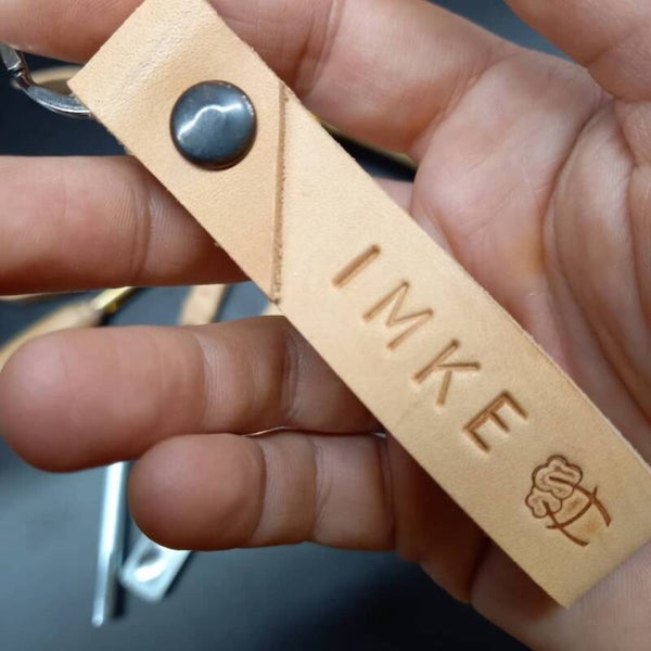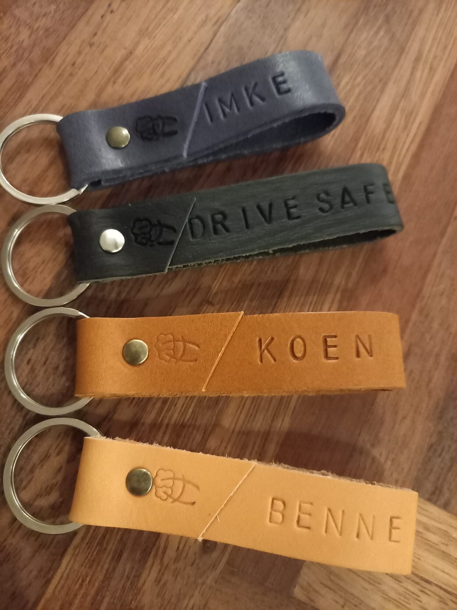 De sleutelhangers worden in ons atelier met de hand gemaakt van echt leder. Ons logo wordt erin gebrand en naar believen kan u uw naam of een woord van maximum 10 letters door ons laten aanbrengen.