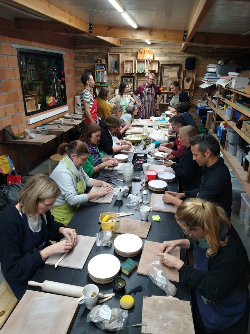 U kan zelf een keuze maken uit ons uitgebreid aanbod, de duur van een workshop is ongeveer 3 u. U kan een keuze maken uit verschillende workshops. We hebben ook gecombineerde workshops, bijvoorbeeld een workshop natuurlijke zeep maken samen met boetseren van een zeepschaaltje of het boetseren van een bloempot met het maken van een lederen bloempothanger, ook een workshop in combinatie met pizza uit de steenoven is mogelijk .